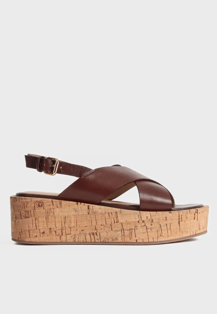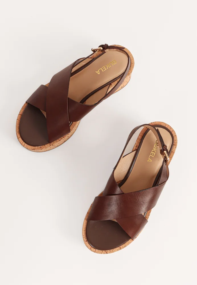 Smukke og moderne sandaler fra BUKELA med et flot kryds-design i brunt kalveskind. Sandalerne har en gummiforstærkende korksål og en justerbar rem ved hælen, som sikrer en god komfort og støtte.