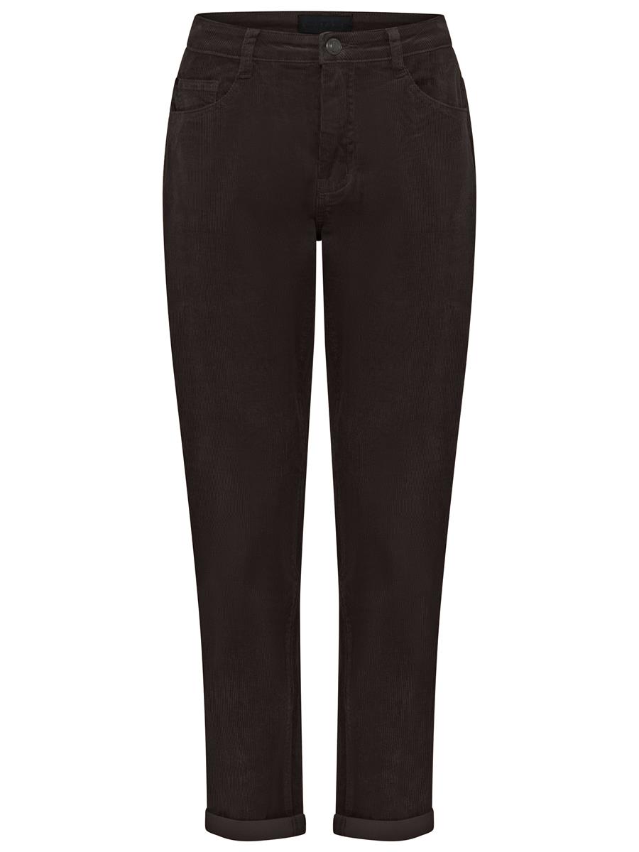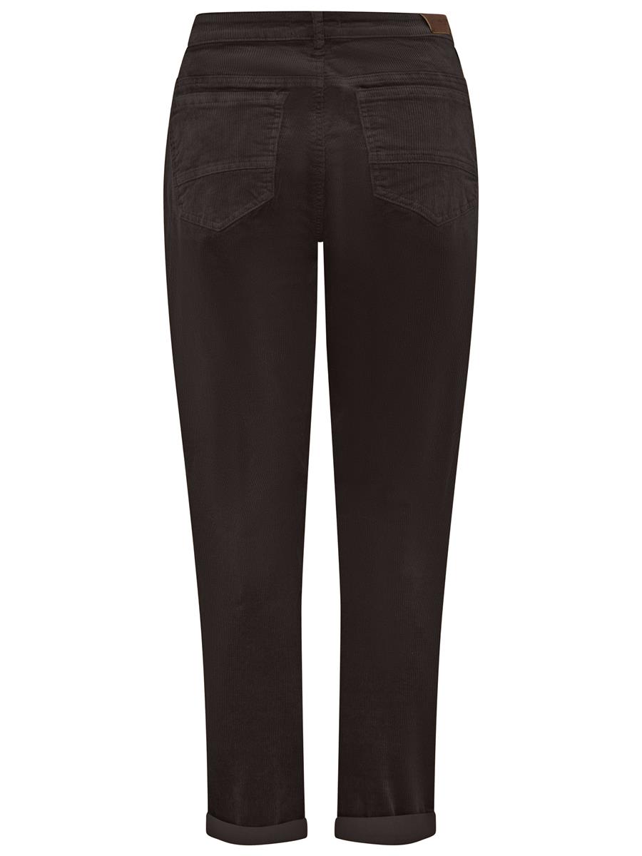Smarte og moderne fløjlsbukser fra Cero & Etage i en flot mørke brun farve. Buksen har knap- og lynlåslukning og bæltestropper. Buksen har et slim fit, skrå forlommer og to baglommer. Dette er den perfekte buks til efterårets mange outfits.