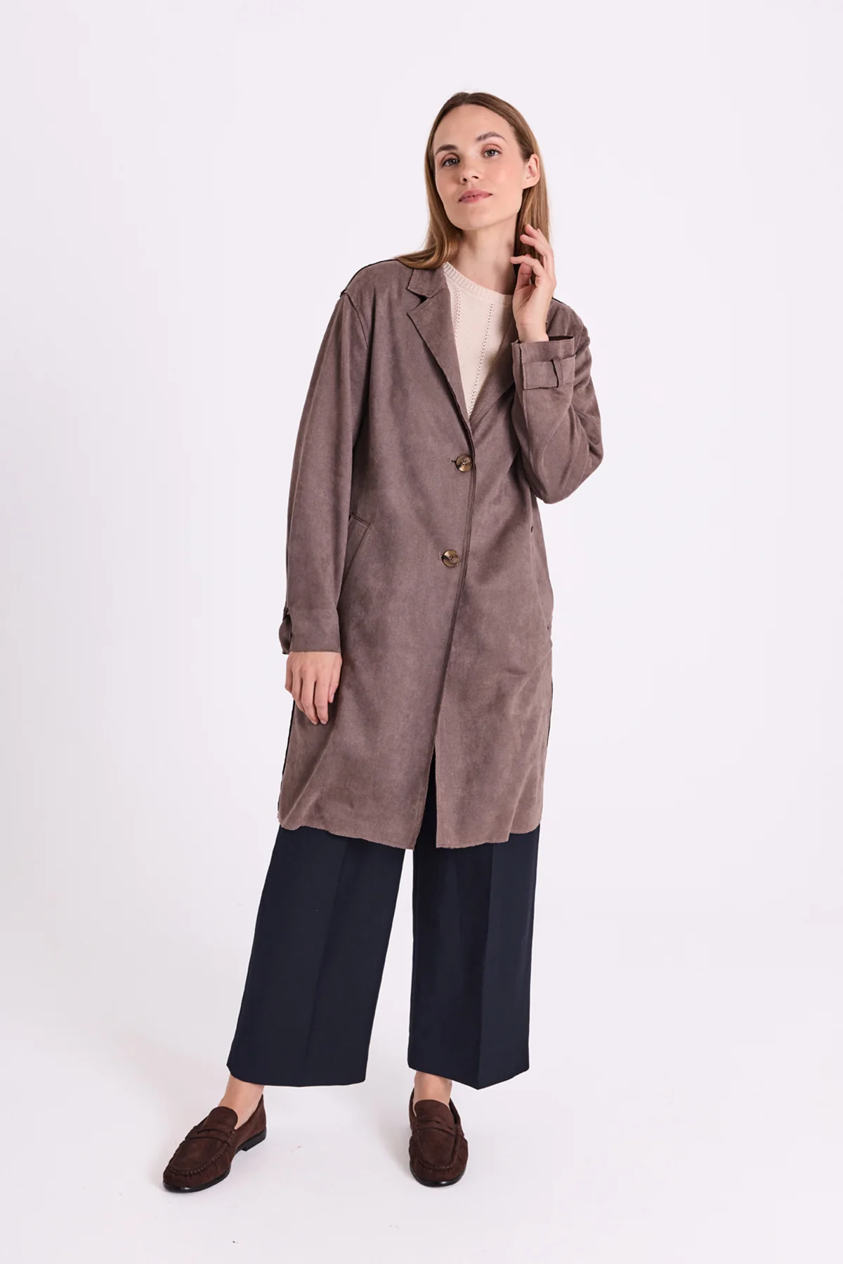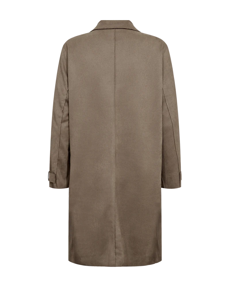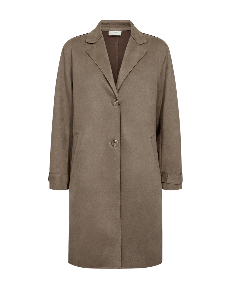 Lang jakke fra Freequent i et blødt og behageligt materiale, der sikrer høj komfort og et stilrent udtryk. Jakken har en enkel og klassisk silhuet med V-hals og revers, lange ærmer samt sidelommer, der gør den både praktisk og elegant. De dekorative knaplukninger med horn-look og fine søm- og syningsdetaljer fuldender designet.
