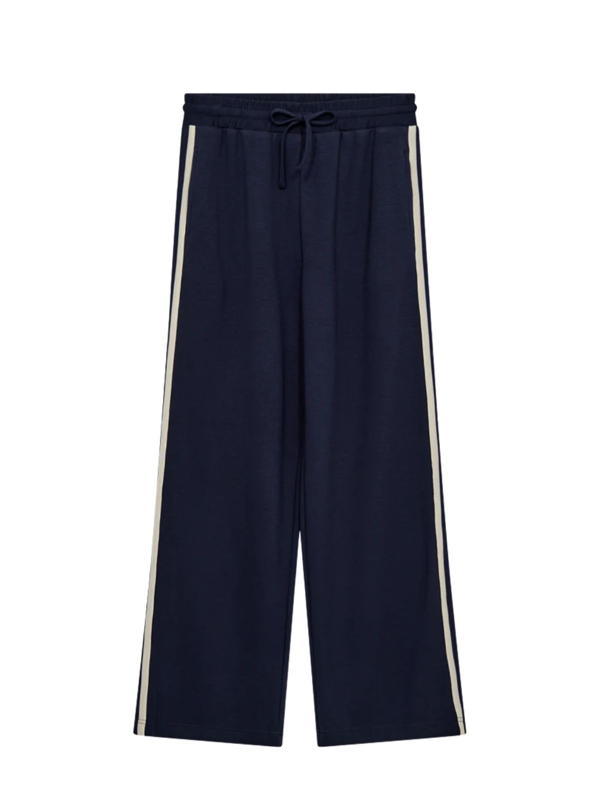 Opdag disse bukser fra Freequent, lavet i en blød og behagelig kvalitet, der sikrer komfort hele dagen. Bukserne har en elastik- og snørejustering i taljen, hvilket gør dem nemme at tilpasse og behagelige at have på. Modellen er designet med sidelommer, brede ben med vidde og tapedetaljer i siderne, som giver et moderne og afslappet look.