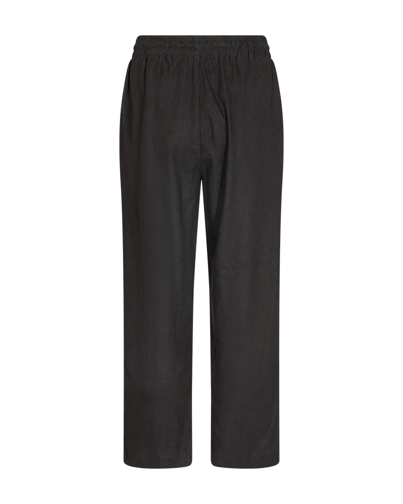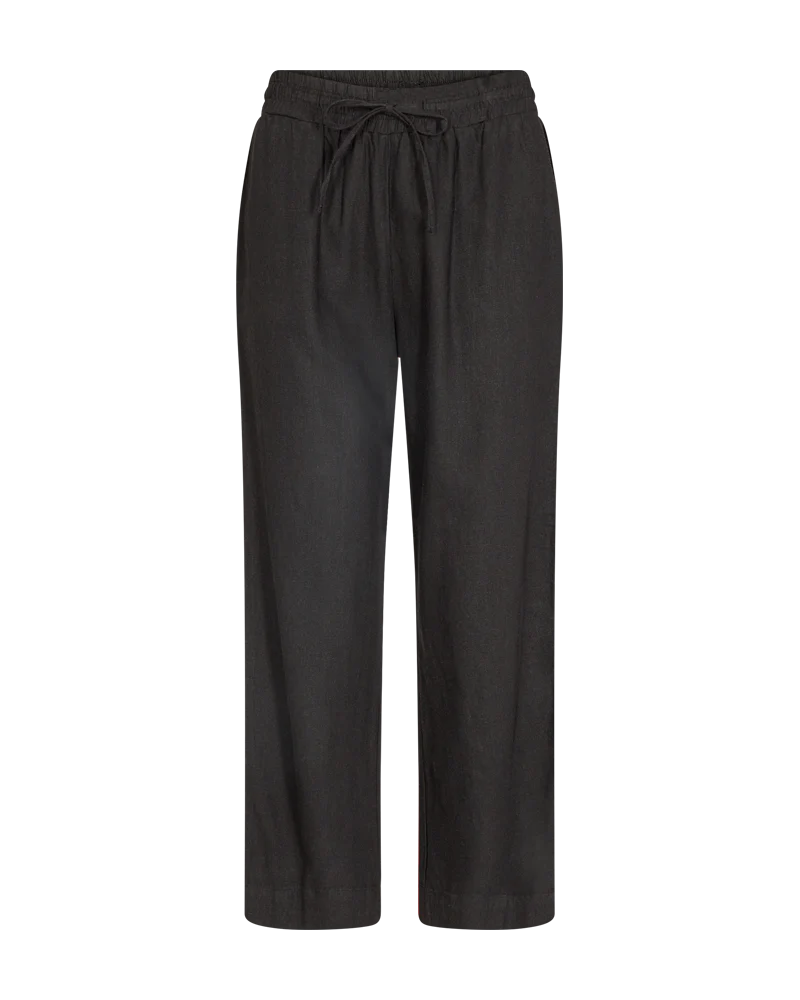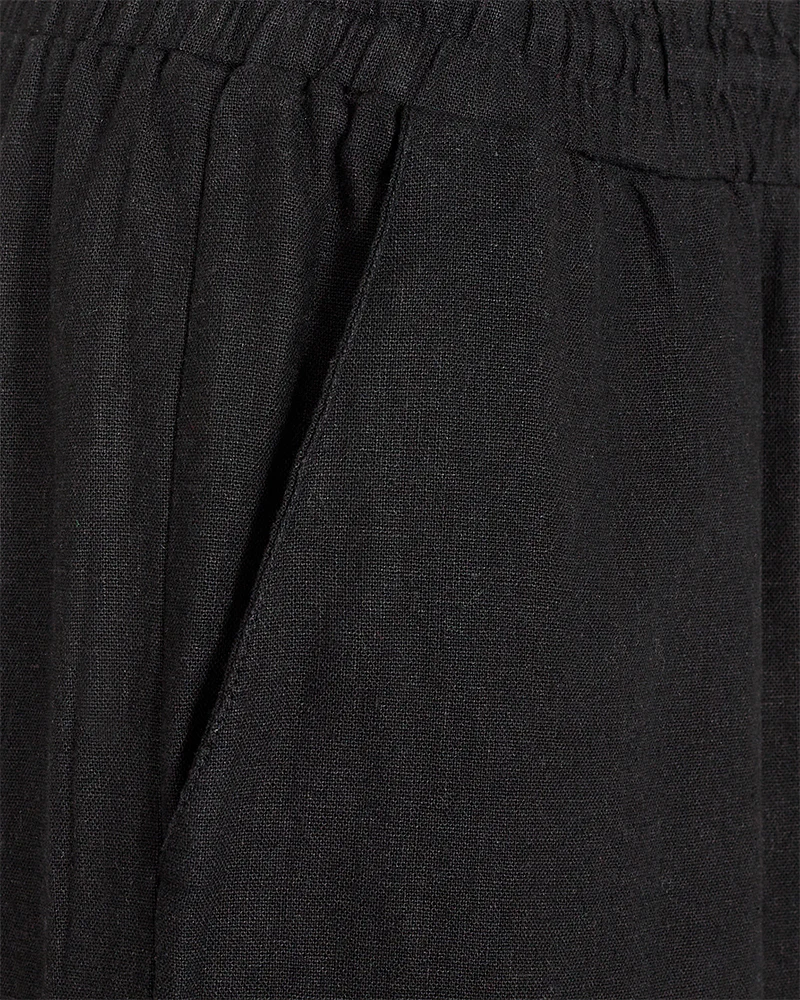 Super lækre hør- og viskosebukser fra FREE/QUENT med ankellængde i sort. Bukserne har en løs pasform, elastik i taljen med snøre, høj talje og sidelommer.