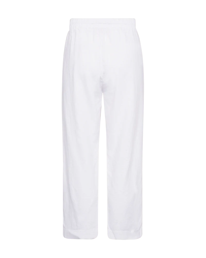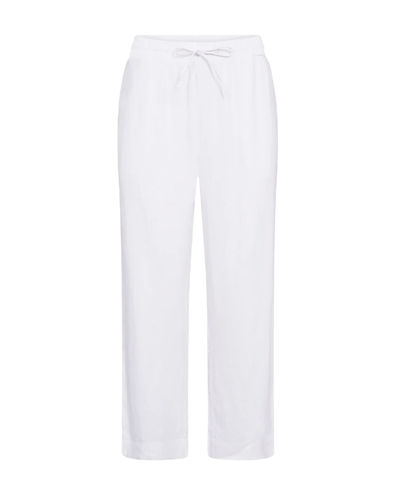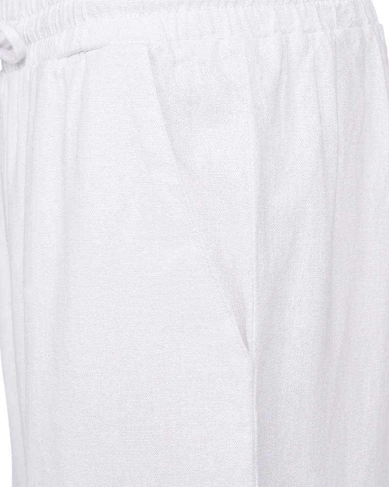 Super lækre hør- og viskosebukser fra FREE/QUENT med ankellængde i hvid. Bukserne har en løs pasform, elastik i taljen med snøre, høj talje og sidelommer.
