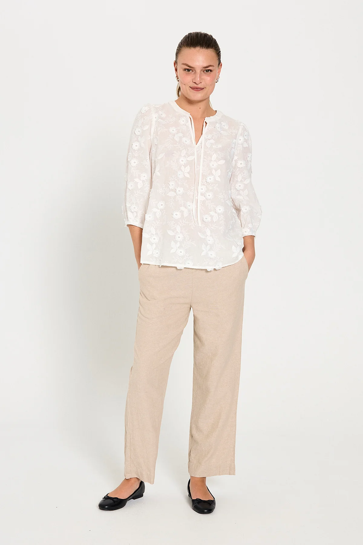 Super lækre hør- og viskosebukser fra FREE/QUENT med ankellængde i sand. Bukserne har en løs pasform, elastik i taljen med snøre, høj talje og sidelommer.