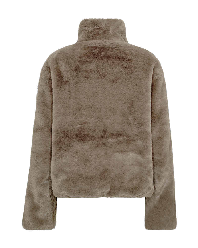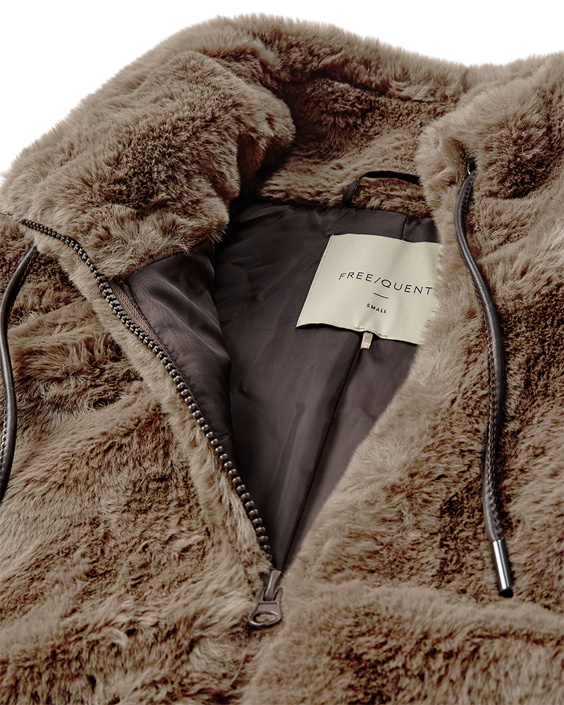 Smart og plysset jakke fra FREE/QUENT i en flot brun farve. Jakken har lynlåslukning foran samt to forlommer. Jakken har høj hals med snøre.