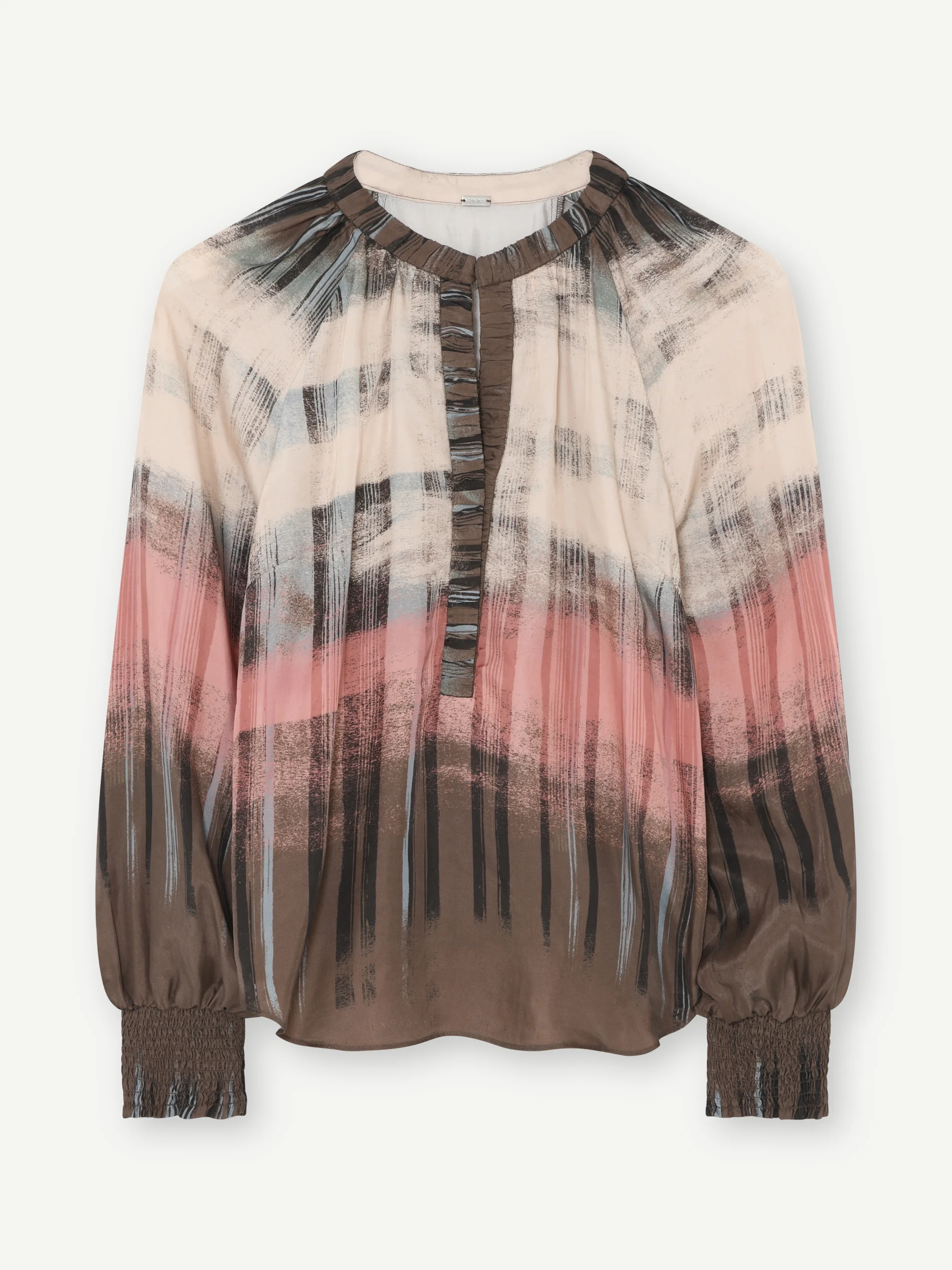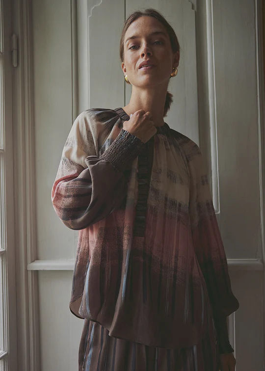 Smuk printet Annsofie bluse fra Gustav, designet i en lækker cuprokvalitet med det fineste dip dye agtige print i fine brune, rosa og cremefarvede nuancer.