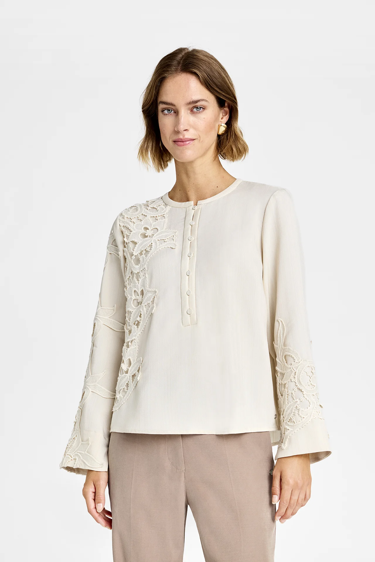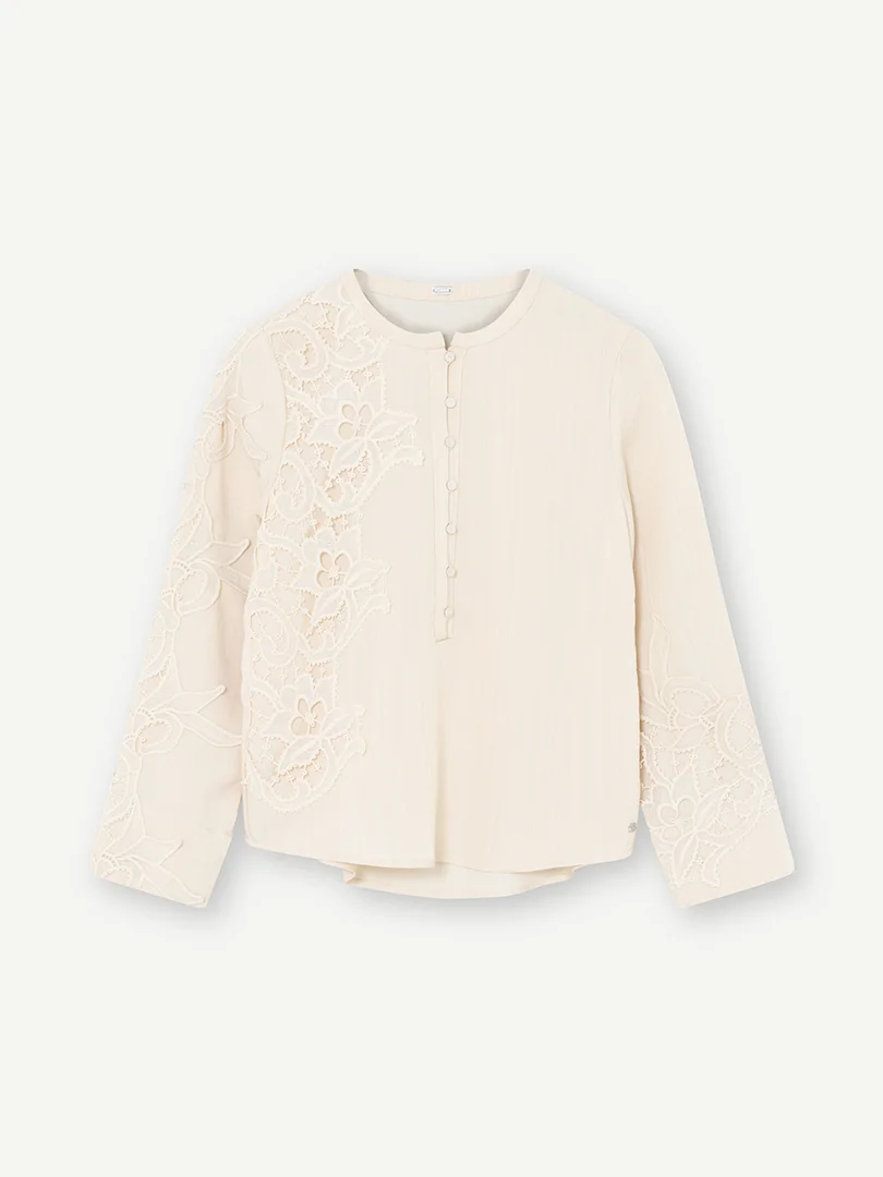 Cana-blusen fra Gustav er et smukt eksempel på sart femininitet og eksklusivt design. Det fine broderi tilfører blusen et unikt og kunstnerisk touch, der løfter det klassiske snit til nye højder. Fremstillet i let, luksuriøst materiale, falder blusen smukt og føles behagelig mod huden.