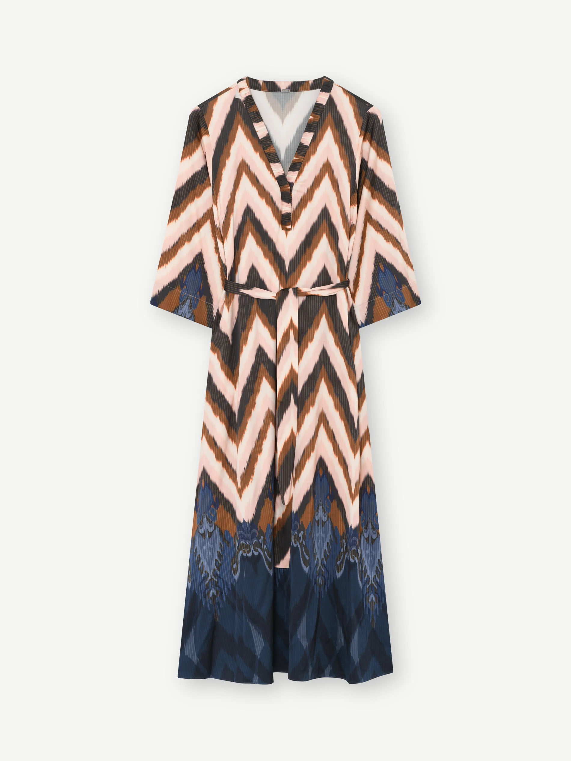 Smuk og moderne kjole fra GUSTAV i de flotteste jordfarver. Kjolen har gulvlængde, trekvart-lange ærmer med vidde, V-hals med en ruflet kant samt et aftageligt tilhørende bælte.