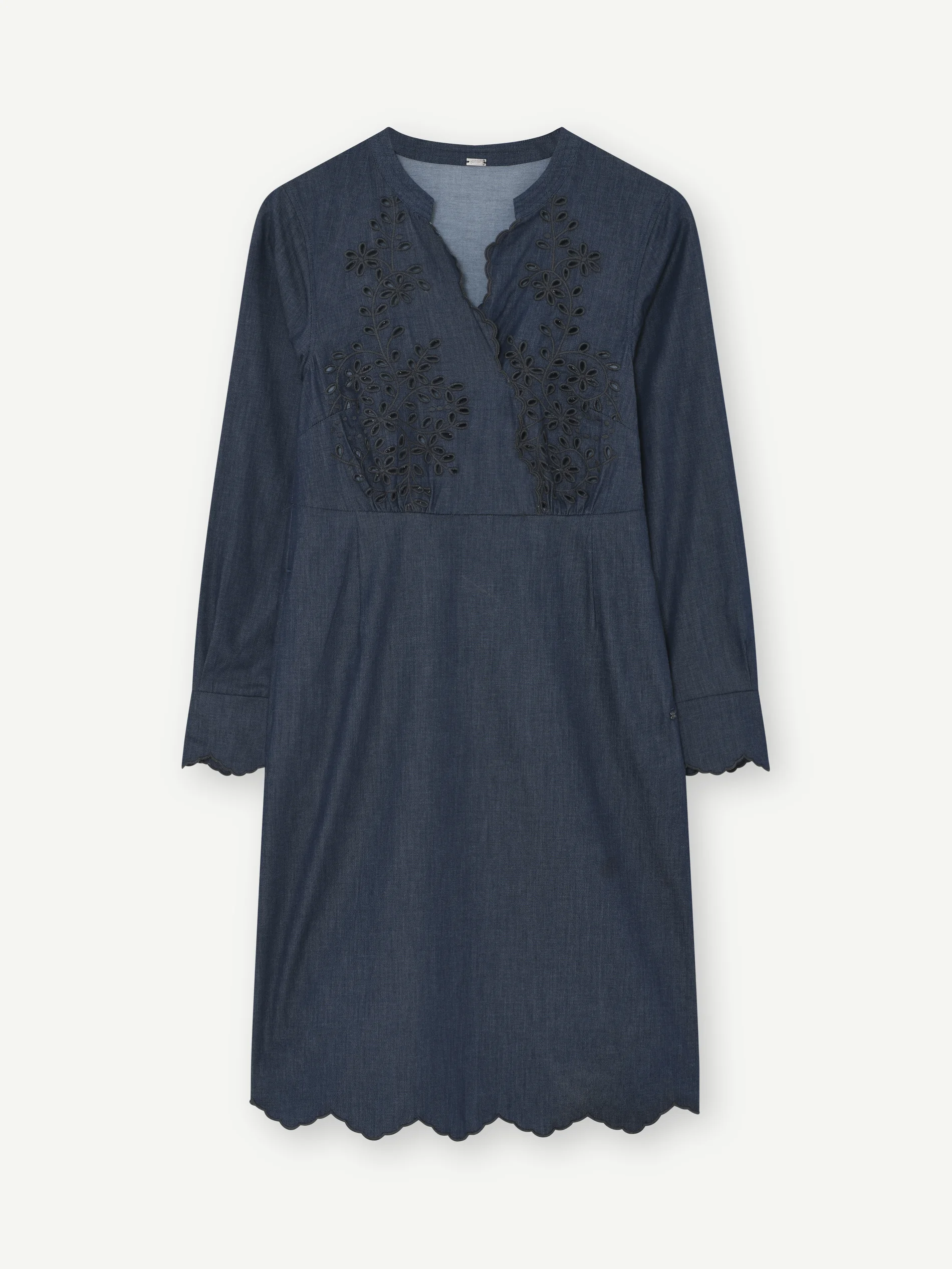 Smart og feminin kjole fra GUSTAV i en bomulds-denimkvalitet. Kjolen har et smukt syet hulmønster foroven og i enderne, som giver ekstra flotte detaljer til kjolen.
