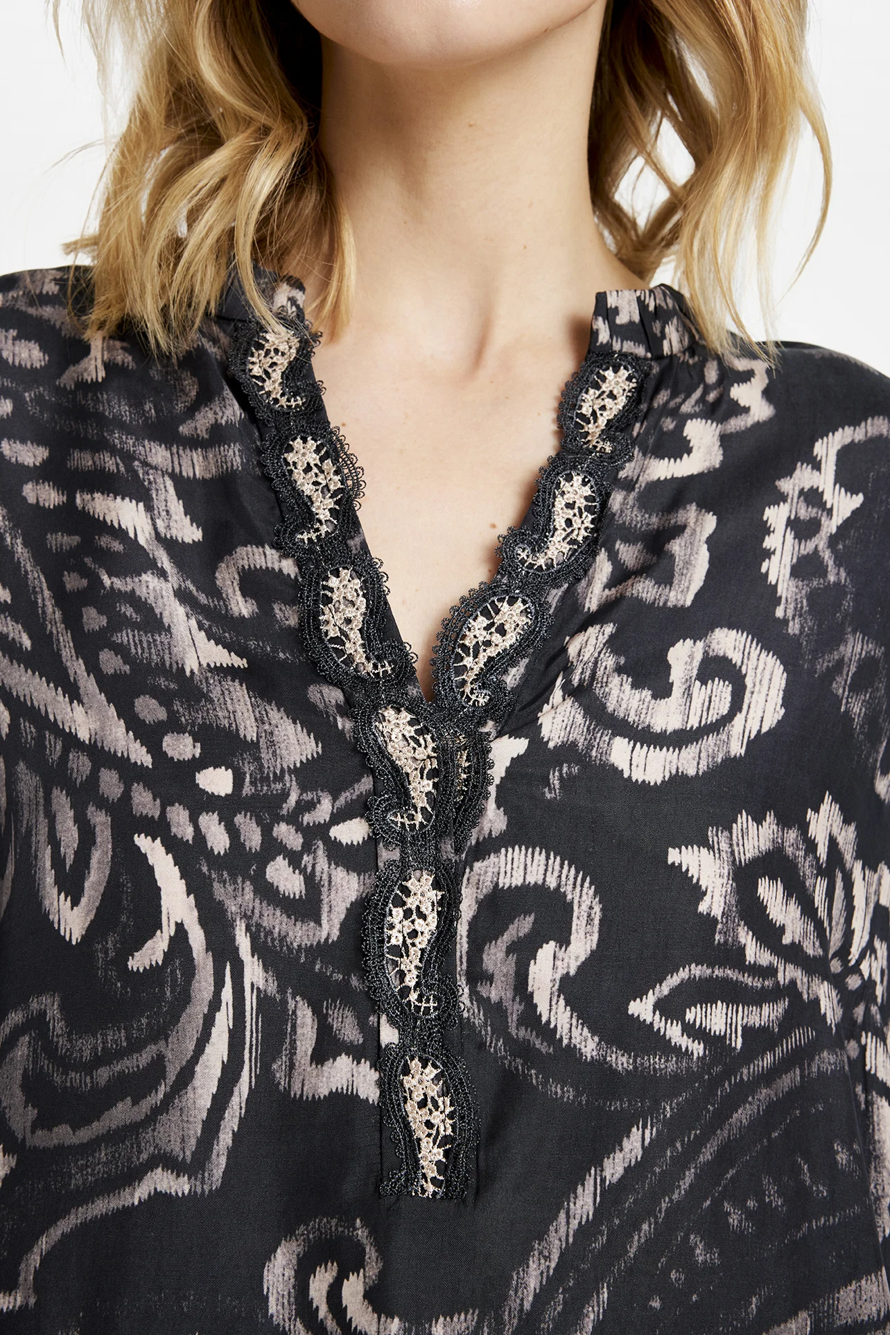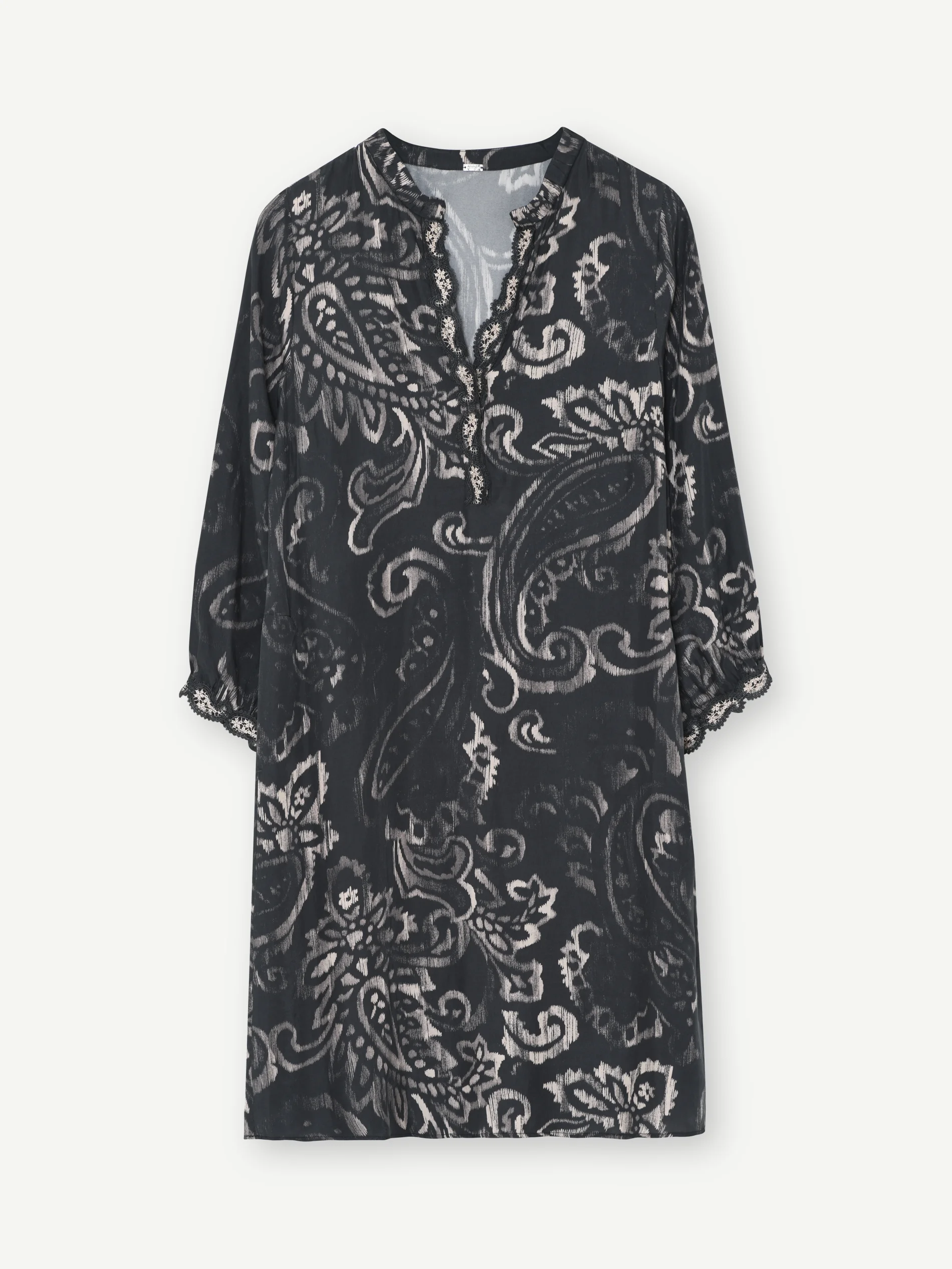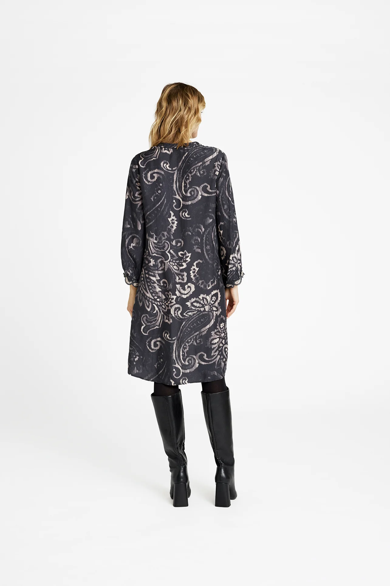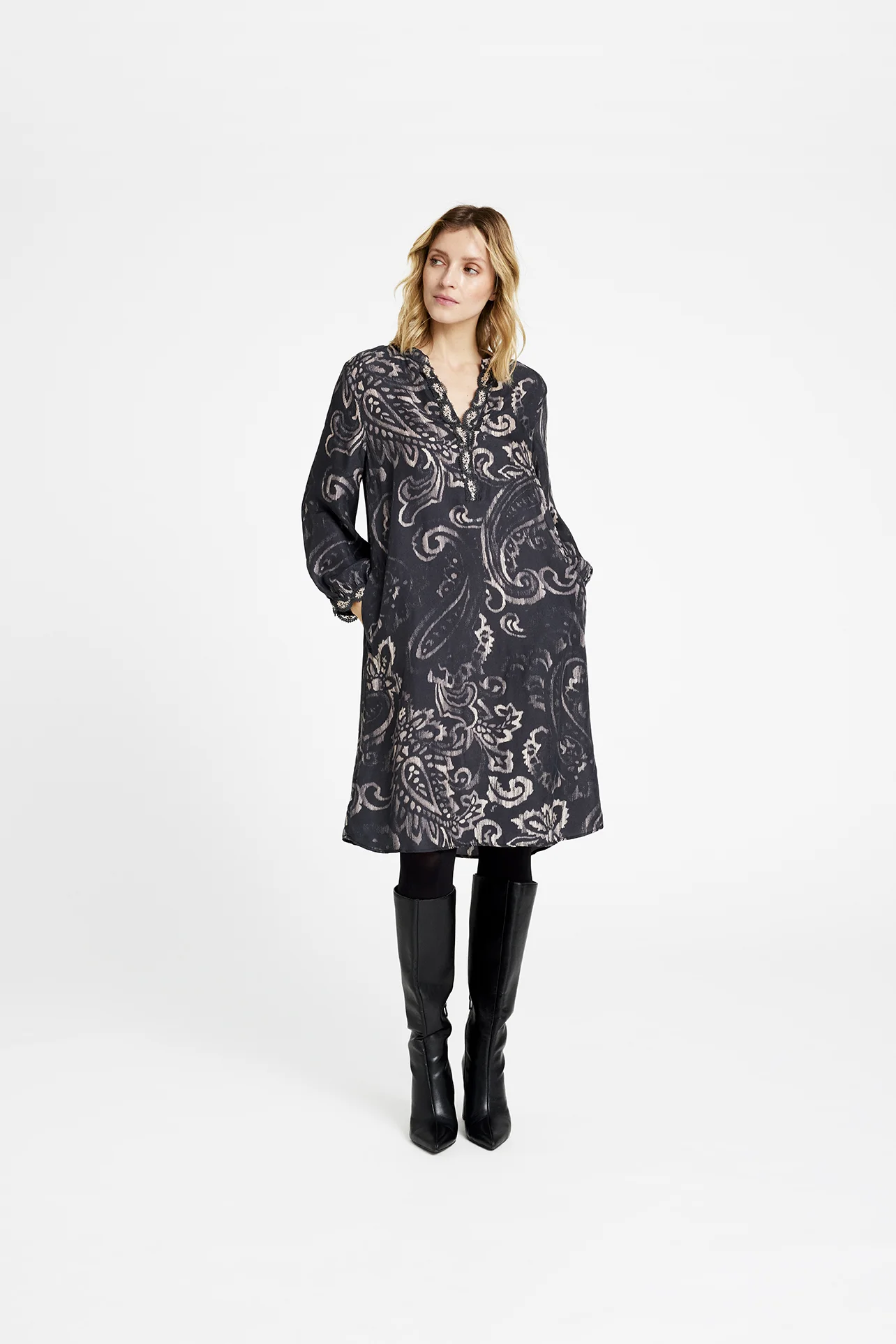 Smart og moderne kjole fra GUSTAV i et smukt sort og råhvidt mønster. Kjolen har lommer, vidde i ærmerne og en knælang længde. Kjolen har derudover de smukkeste syede detaljer i halsen, ærmerne og enden af kjolen.