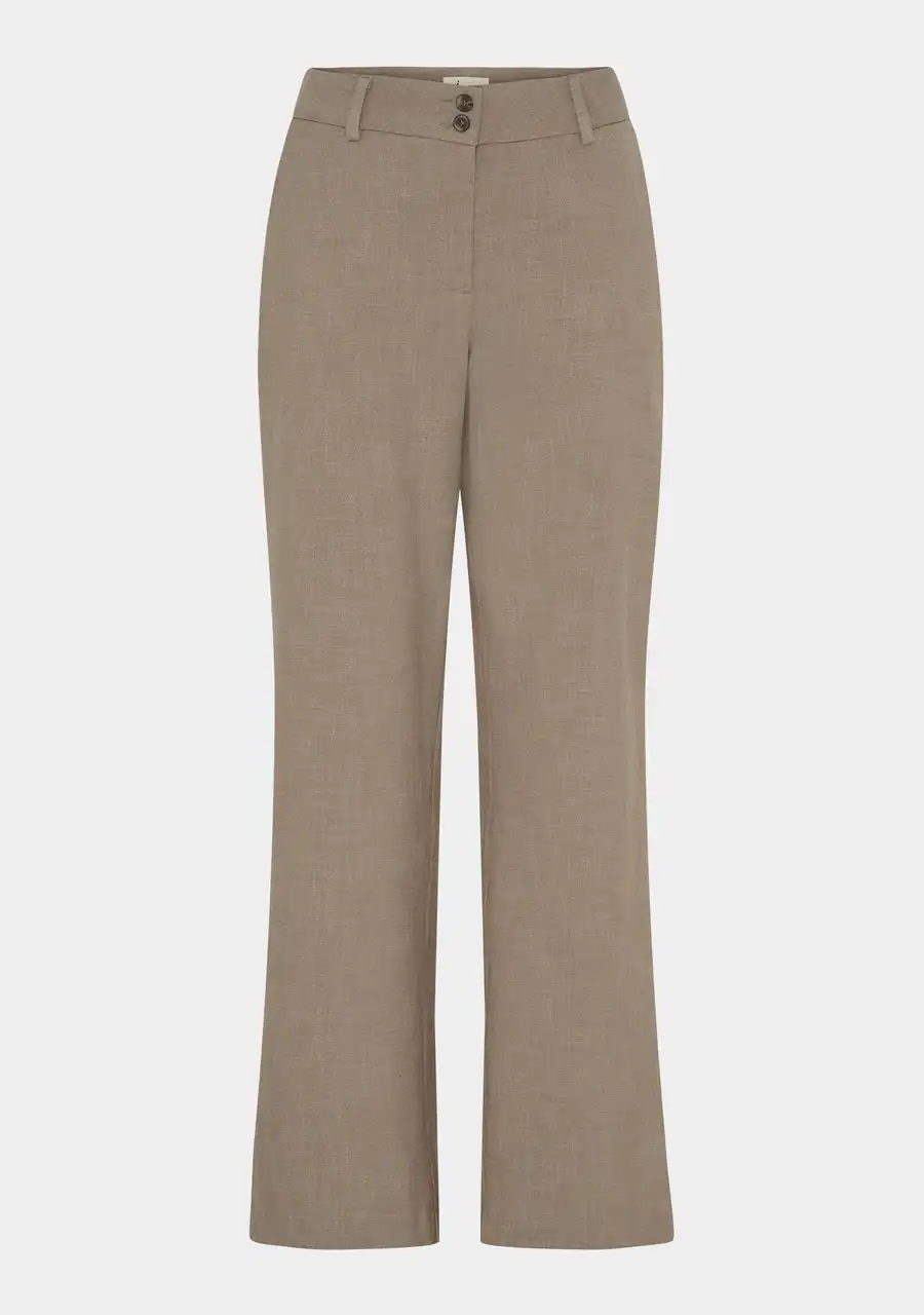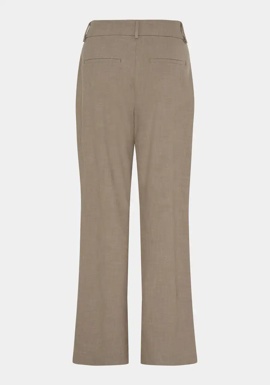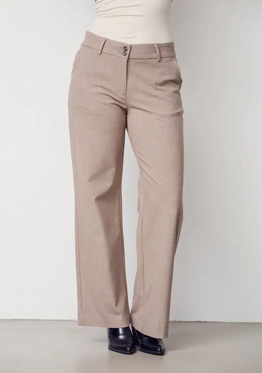 Den mellemhøje talje er udstyret med to knapper, lynlås og bæltestropper, hvilket giver en flatterende og praktisk pasform. Sidelommerne er diskrete, mens de paspolerede baglommer understreger det elegante look. Uanset om du styler bukserne med en skjorte, blazer eller strik, får du et klassisk og sofistikeret outfit, der fungerer til enhver lejlighed.