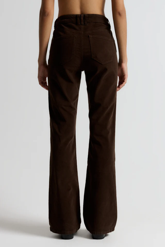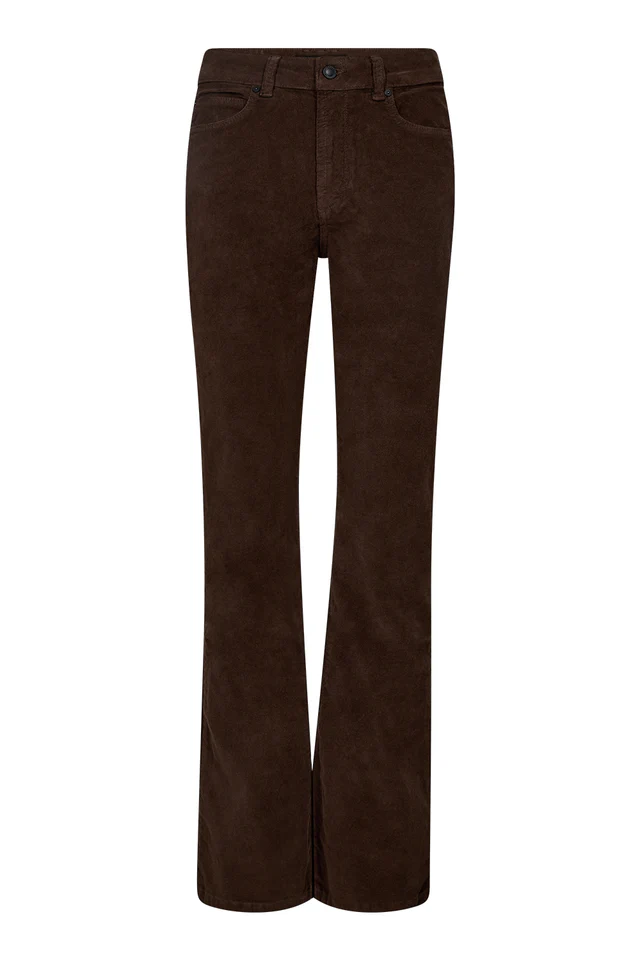 Smarte og moderne bukser fra Ivy Copenhagen i babyfløjl i en flot mørkebrun farve. Denne buks har svaj i benet, hvilket giver en flot og feminin pasform. Buksen har en middelhøj talje og lynlås- og knaplukning og bæltestropper. Tara buksen fås i flere længder; dette er en længde 30.
