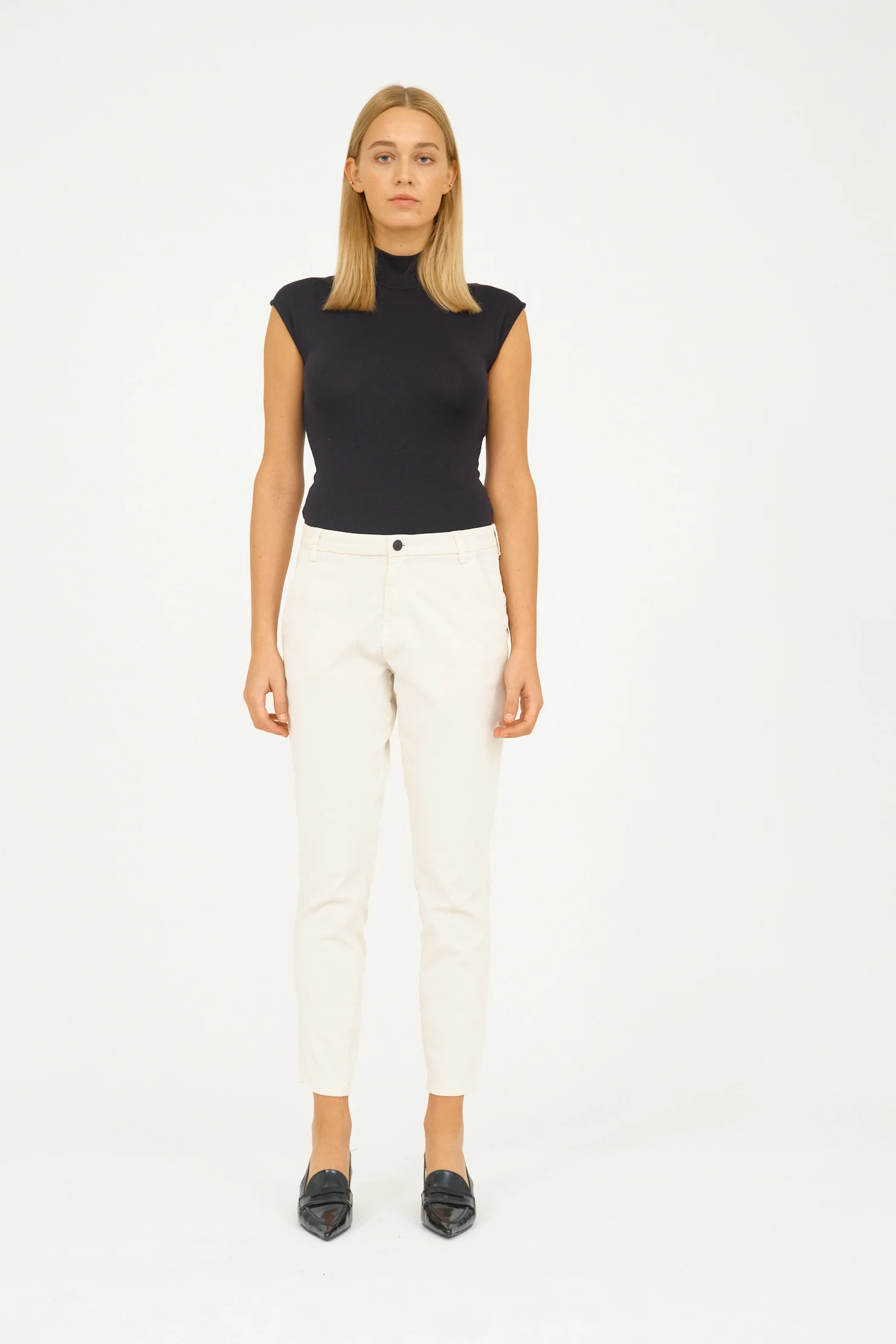 Smarte chino-bukser fra IVY Copenhagen i den flotteste creme farve. Buksen har skrå forlommer og lynlås- og knaplukning og et cropped fit. Der er detaljer med syninger omkring knæene. Karmey jeans fås i flere længder; dette er en længde 30.