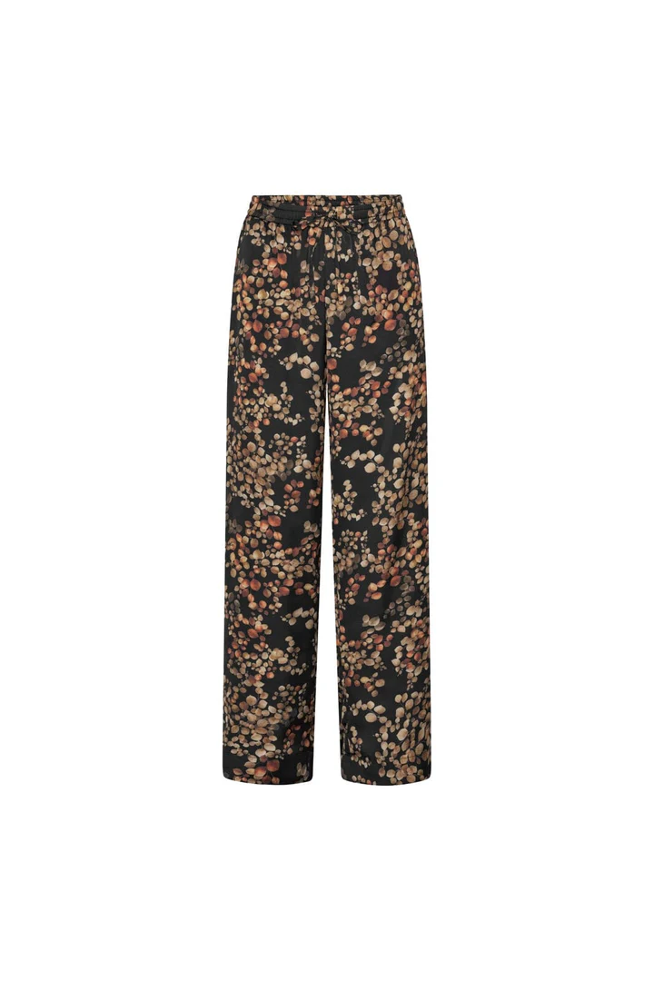 Opgrader garderoben med disse elegante Karmamia-bukser, designet med et kunstnerisk, abstrakt mønster i smukke brune og beige nuancer på en sort baggrund. Den lange model med lige ben skaber et flatterende og tidløst udtryk, mens den løse pasform giver maksimal komfort.
