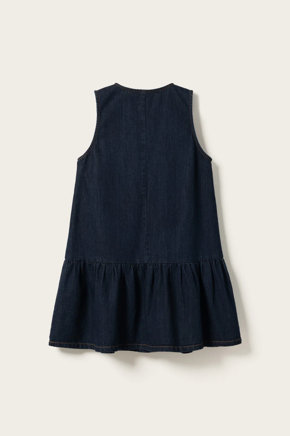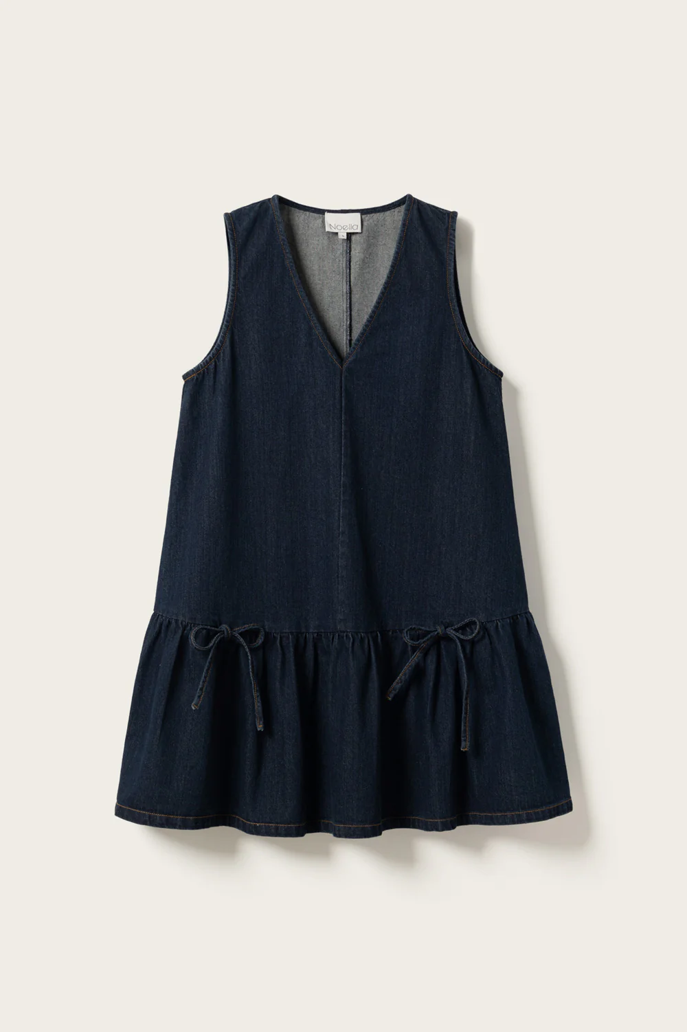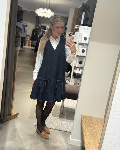 Lavona Dress er en stilren og feminin denimkjole i A-facon, designet uden ærmer og med en elegant V-udskæring, der giver et let og sommerligt udtryk. Kjolen har et smukt fald.