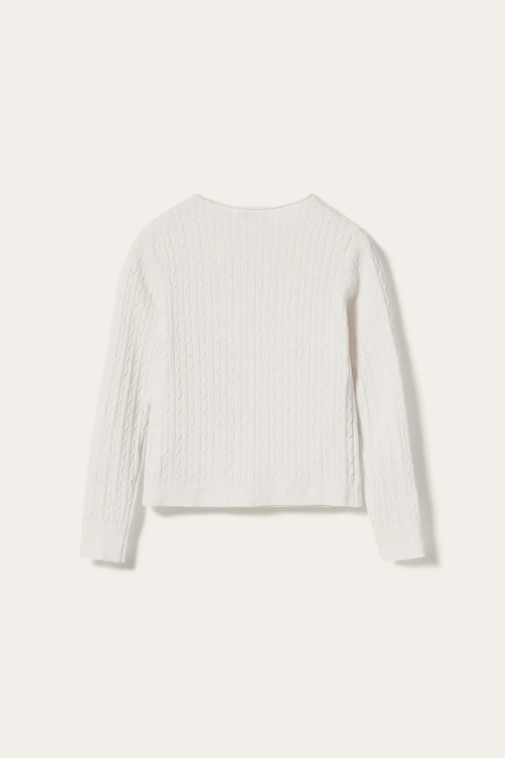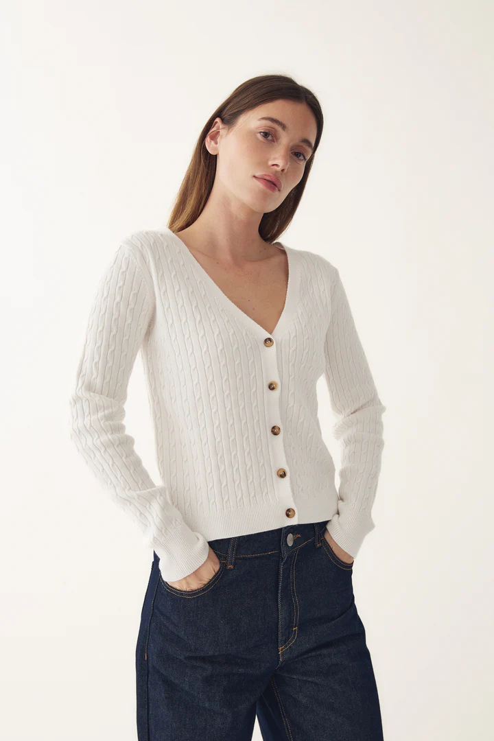 Cardiganen har et klassisk snit med lange ærmer og en åben front, hvilket gør den nem at style over alt fra fine kjoler til casual jeans. Den neutrale ivory-farve giver et sofistikeret look og kan let matches med andre farver og mønstre i din garderobe.