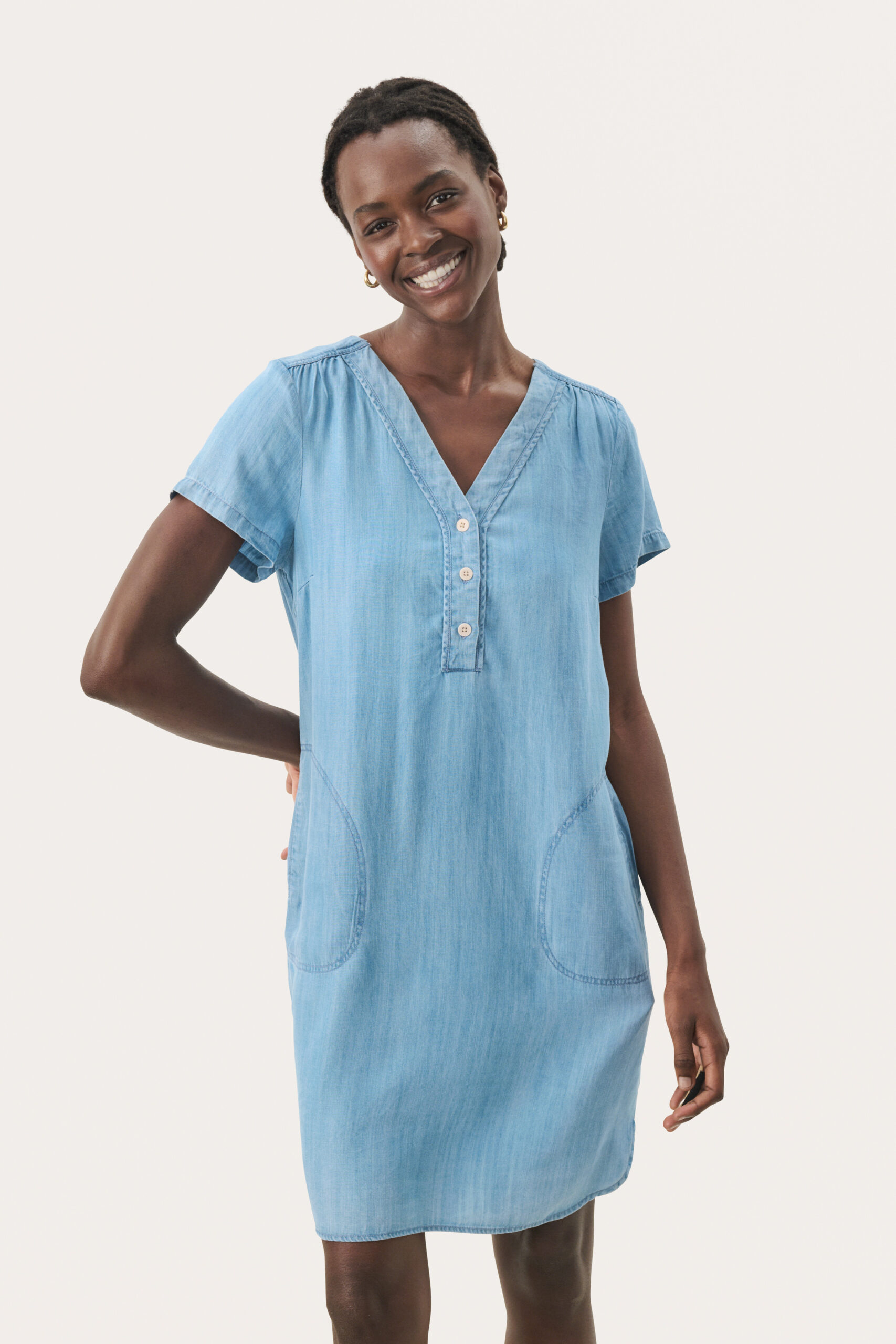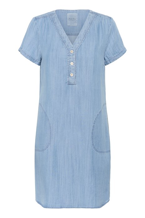 Flot og sommerlig kjole fra Part Two i en luftig og åndbar kvalitet. Kjolen har korte ærmer, V-hals med knaplukning og to forlommer som er fremhævet af syninger.