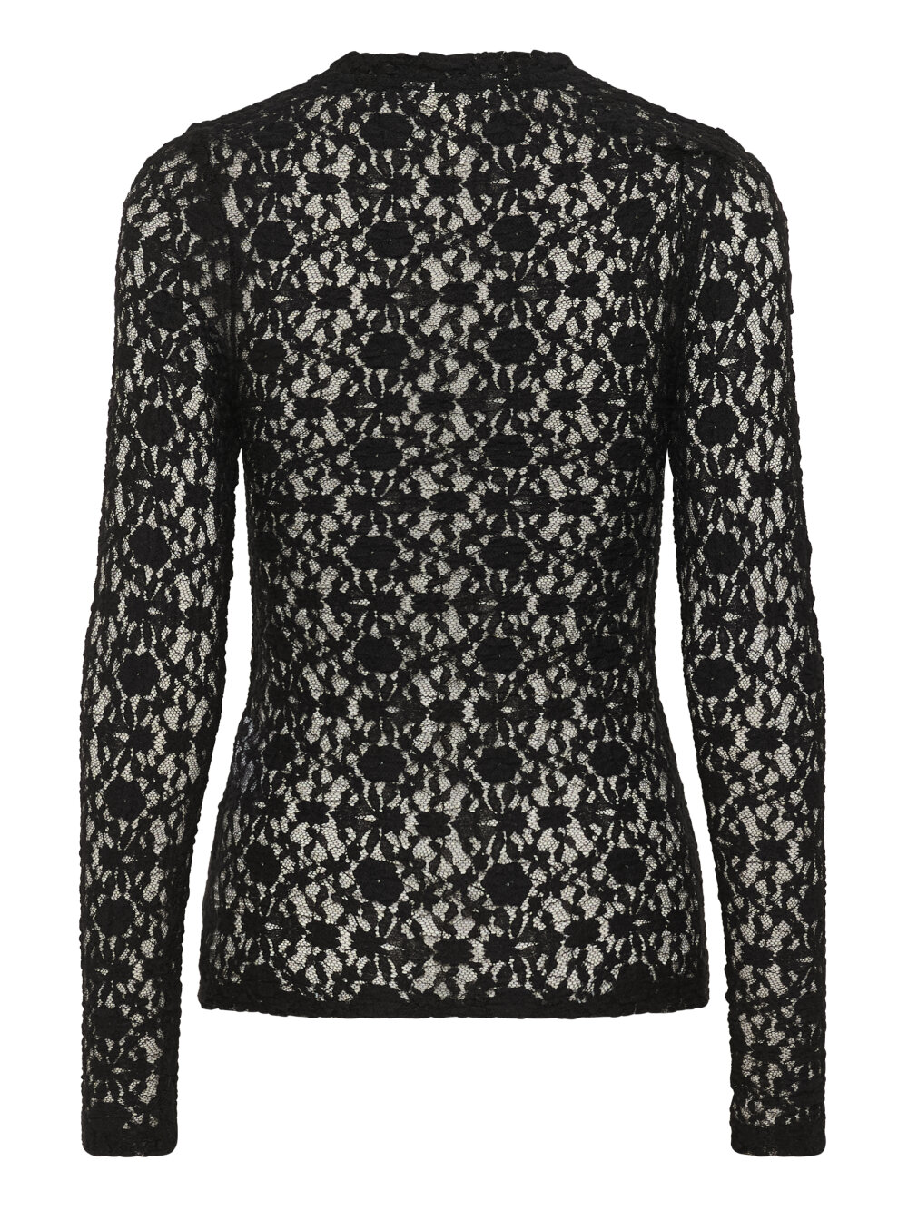 Denne smukke og tætsiddende blondetop til kvinder er designet i en let transparent, blød kvalitet, der føles behagelig mod huden. Toppen har lange ærmer, en klassisk rund halsudskæring og et elegant blomsterblonde-mønster, som tilføjer et feminint udtryk til både hverdag og fest.