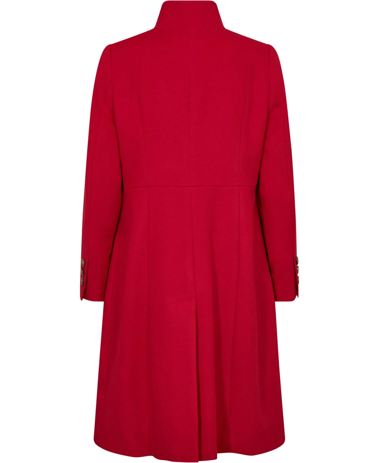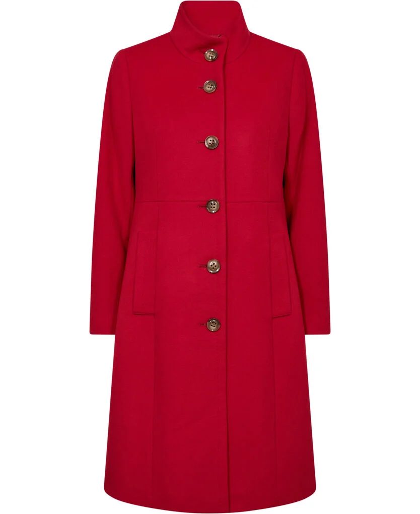 Den smukke røde farve giver et feminint og eksklusivt udtryk, mens den let taljerede pasform fremhæver figuren på elegant vis. Frakken har rene linjer, diskrete lommer og klassisk knaplukning, som gør den tidløs og anvendelig sæson efter sæson.