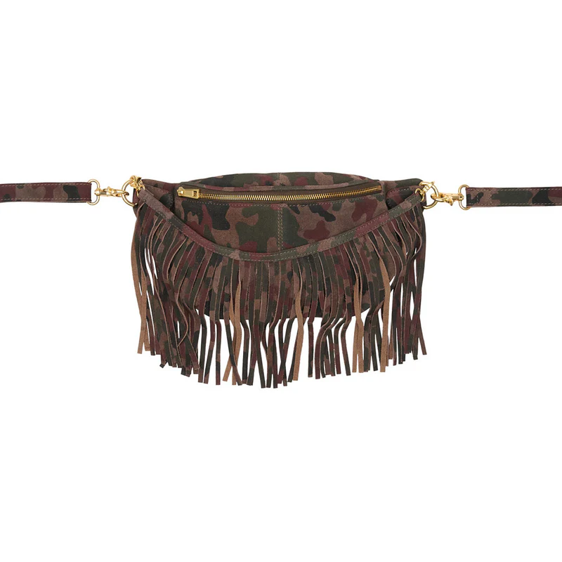 Bumbag med 2 lynlåse, aftagelig frynser og justerbar rem. Ruskind. Camouflagemønster.